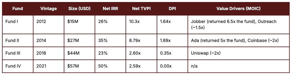 Optically, the team is playing a ‘value’ game. Unlike Ribbit and USV - who’s early outperformance came from picking (and paying for) premium - Version One’s was baked into the convexity of their small fund and low entry prices approach. There’s an idea that “There isn’t a secondary market, there’s a list of 20 companies with infinite demand for their equity.” As Version One have yet to invest early into a $10B dollar company, this value approach might explain the TVPI-DPI difference. Alternatively, that the team recently bought secondaries in both Jobber and Headout could also explain the difference.
