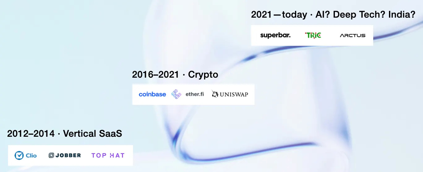 The Third Act of Version One - the one you’re likely to meet if you speak to the team today - is massively exploratory. Boris has been personally LP’ing into other funds since 2013 and the team have made many direct investments into India, deep tech, healthcare and vertical AI off the back of these nodes.2