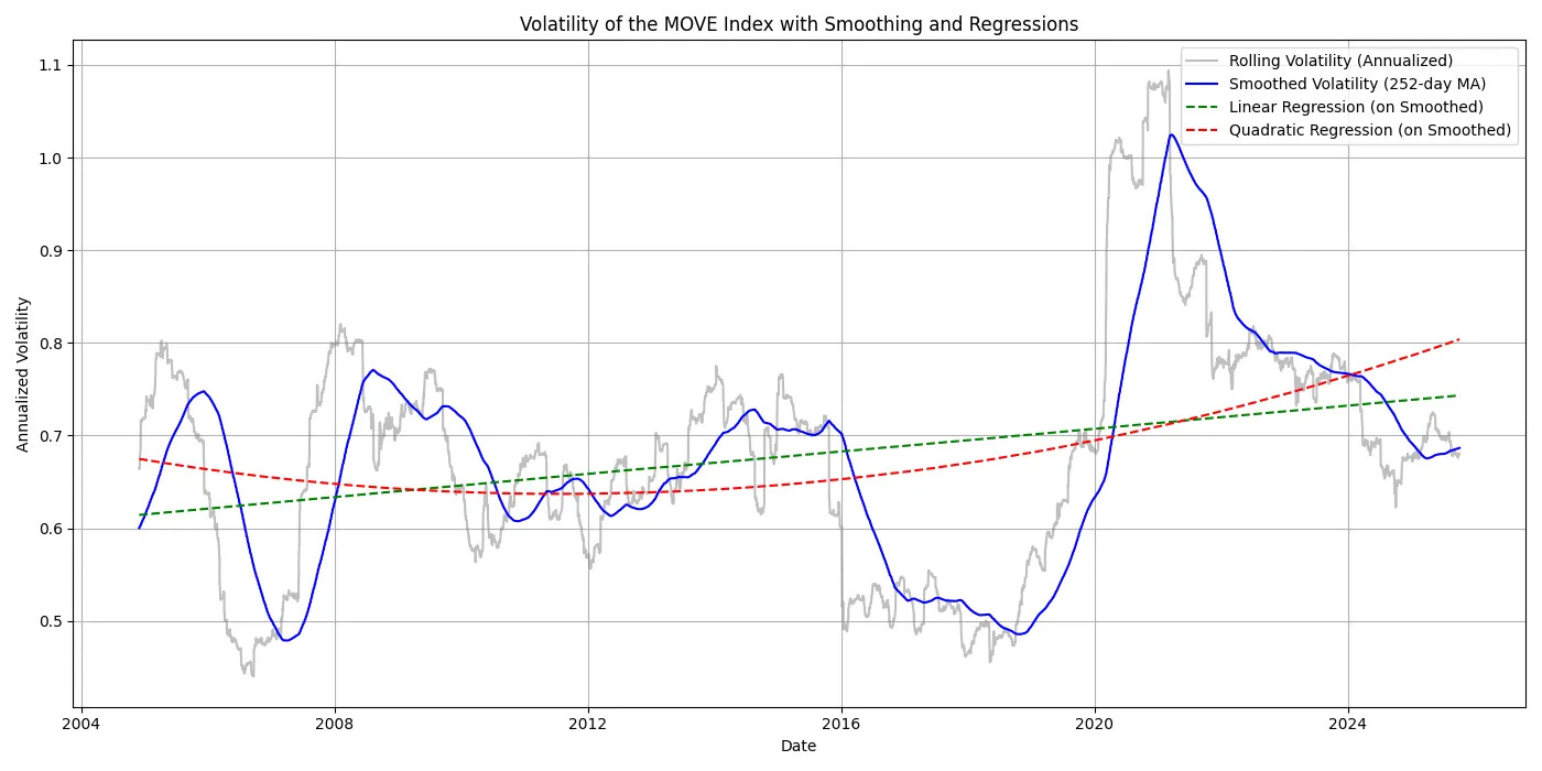 If we’re right, we should see a similar trend in bond kurtosis. Looking at both the volatility of the MOVE Index, like the VIX for a range of treasury maturities, and the kurtosis for the 10-year one, there’s a similar uptrend.
