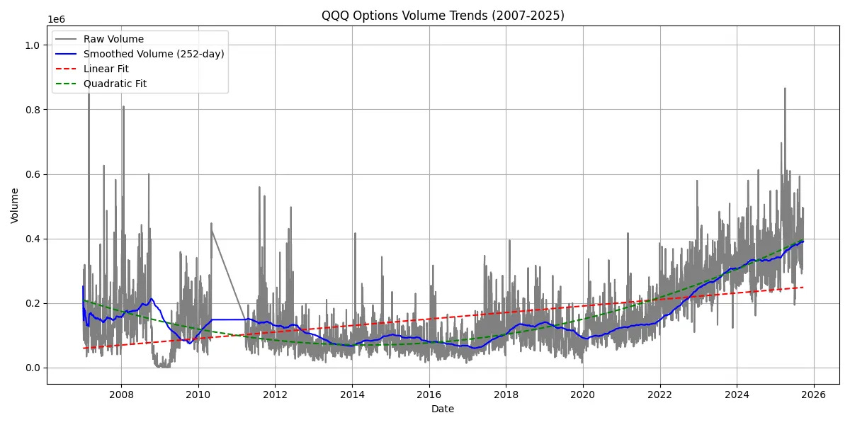 Firstly, things changed quite a bit after the GFC: regulations mandated dealers - banks and high frequency trading firms - to hold less stock on their books, so there’s a thinner buffer when orders surge. Most trades nowadays are algorithmically driven, and can widen or step back near instantaneously in response to changing risk levels. Many algorithms (like ETFs) or participants use similar signals and limits to make decisions, so when volatility jumps, they all cut risk together. That means less depth just as more orders hit, and price impact ramps up quickly rather than gradually.6Secondly, the generational wealth transfer from boomers to millennials and Gen Z creates rising liquidity (as portfolios are reshuffled) at just the time that retail trading is becoming massively accessible. Robinhood introduced options trading in December of 2017. You can see the influx of retail in the options volume data for the Nasdaq 100 from then onwards.7