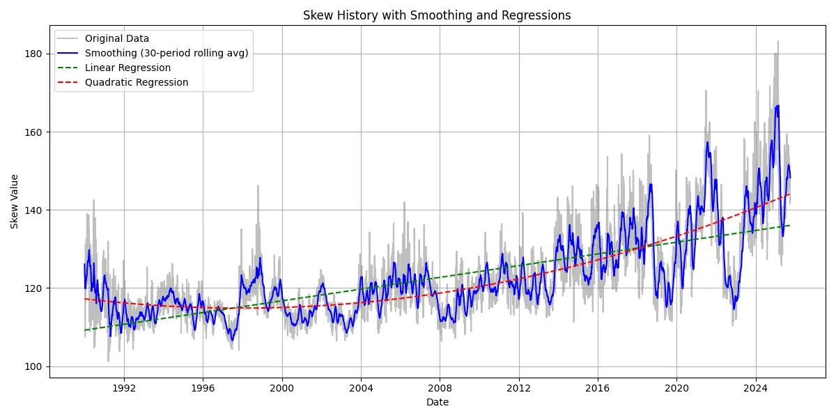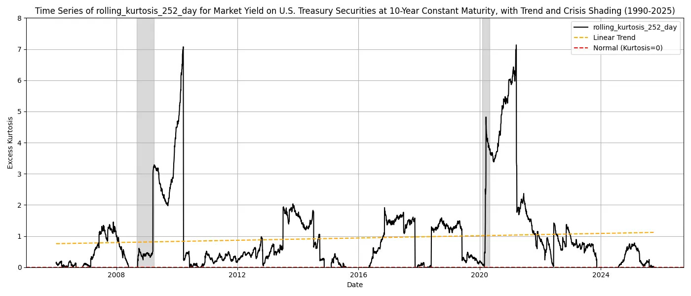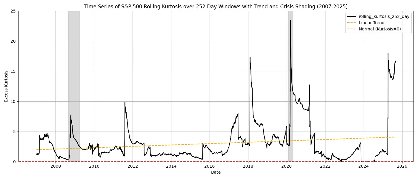 Look at a chart of the VIX (the index measuring the volatility of the S&P500). You’ll notice it’s pretty stable with some spikes around the GFC and COVID. What we’re interested in is not “is the VIX increasing over time” but rather “are the spikes of the VIX getting bigger, and more frequent”. When you fatten the tails in a distribution, you decrease the frequency of small-scale volatility and increase the outliers. The term we use for measuring this fatness is kurtosis. Looking at the kurtosis of SPY’s price action over an annualised window, you’ll see a small and steady increase since 2007.