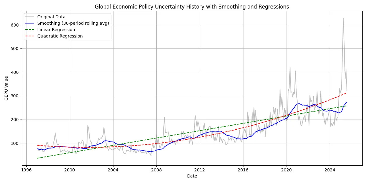 Global policy also seems chaotic. Biden’s asset freezes and Trump’s tariffs - you only have to look at the price action of gold as central banks increase reserves at the expense of USD to see the erosion of trust. The most widely accepted measure of global policy uncertainty is a GDP-weighted average of national EPU indices for 20 countries put together by a couple Stanford profs. Graphing this out, it seems not only increasingly uncertain, but increasing in an increasing way.