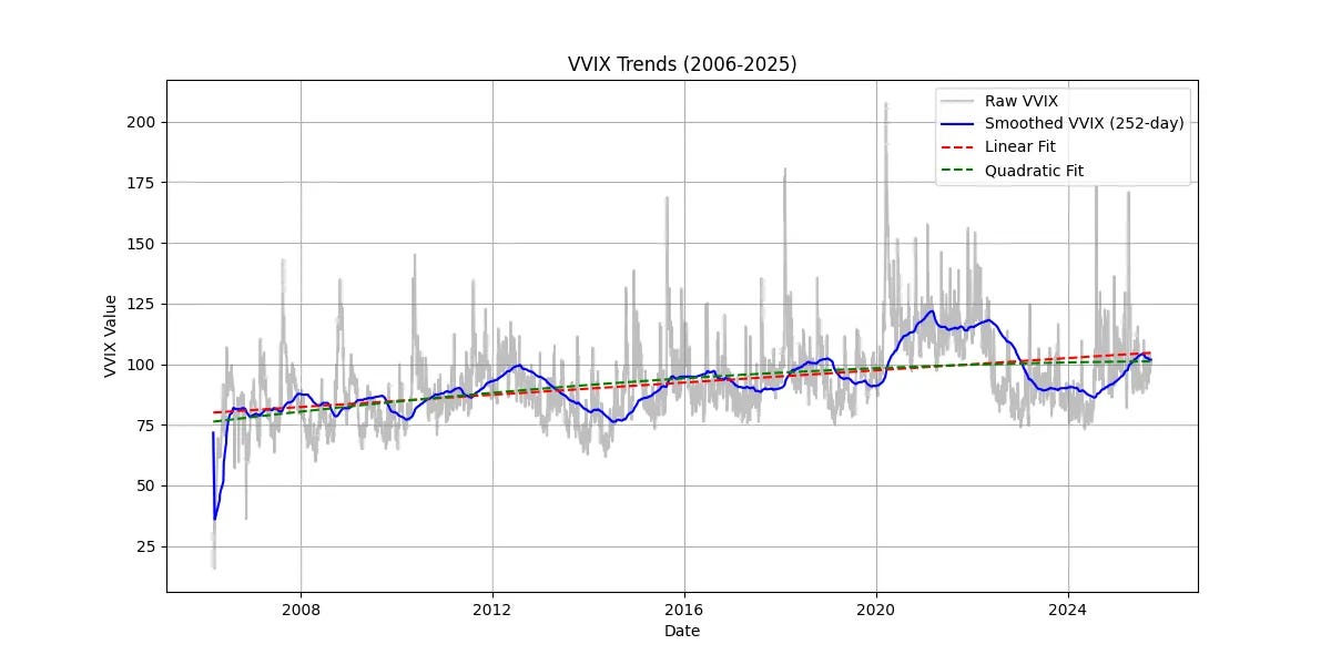 We’re interested not in how volatile the index is, but how volatile it’s volatility (vol-of-vol) is. Vol-of-vol is not quite the same as kurtosis, but it’s a good enough proxy for us. The index for this - the VVIX - has data from 2006 onwards. Looking at the VVIX, there’s a bunch of noise but again we’ve got a small uptrend over the same timeframe.2