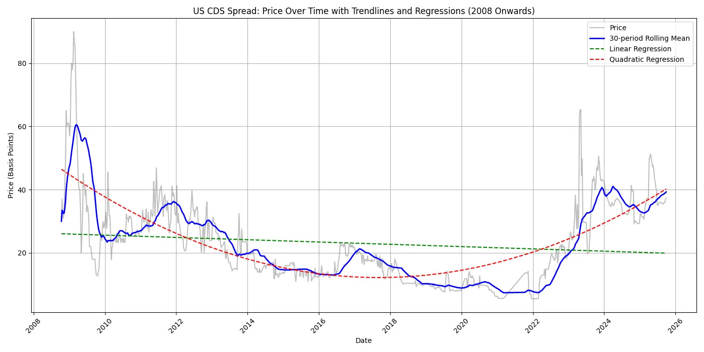 One way to hedge credit risk (made famous by The Big Short) are credit default swaps, which pay out when people default on their debt. Like the SKEW index, the US 5 Year CDS spreads (the cost of insuring against the US defaulting) has been steadily rising over the last decade. Given how bad it would be for the global bond market if the US were to default, this can be seen as a bond-market proxy for the kind of extreme price action that SKEW captures in equities.3 Notice how we’ve been steadily approaching 2008 levels since 2022.